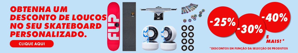 Explore a nossa gama completa de equipamento de skateboarding - desde skates completos a trucks, decks e acessórios - concebida para satisfazer as exigências de todos os skaters apaixonados, desde principiantes a profissionais.